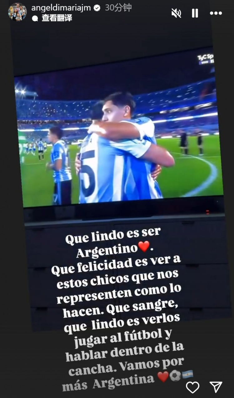 迪馬利亞曬出自己在家中觀賽的照片,并寫道:“作為阿根廷人是多么美好啊????吹竭@些孩子們用他們的方式代表這支球隊(duì)出戰(zhàn),我們感到非常高興。多么熱血,看到他們?cè)趫?chǎng)上踢球、聊天是多么美好。讓我們更加努力吧,阿根廷??!”