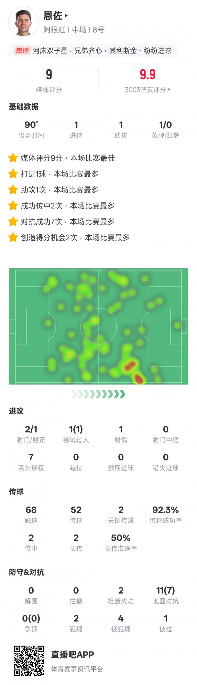 恩佐本場比賽數(shù)據(jù)如下: