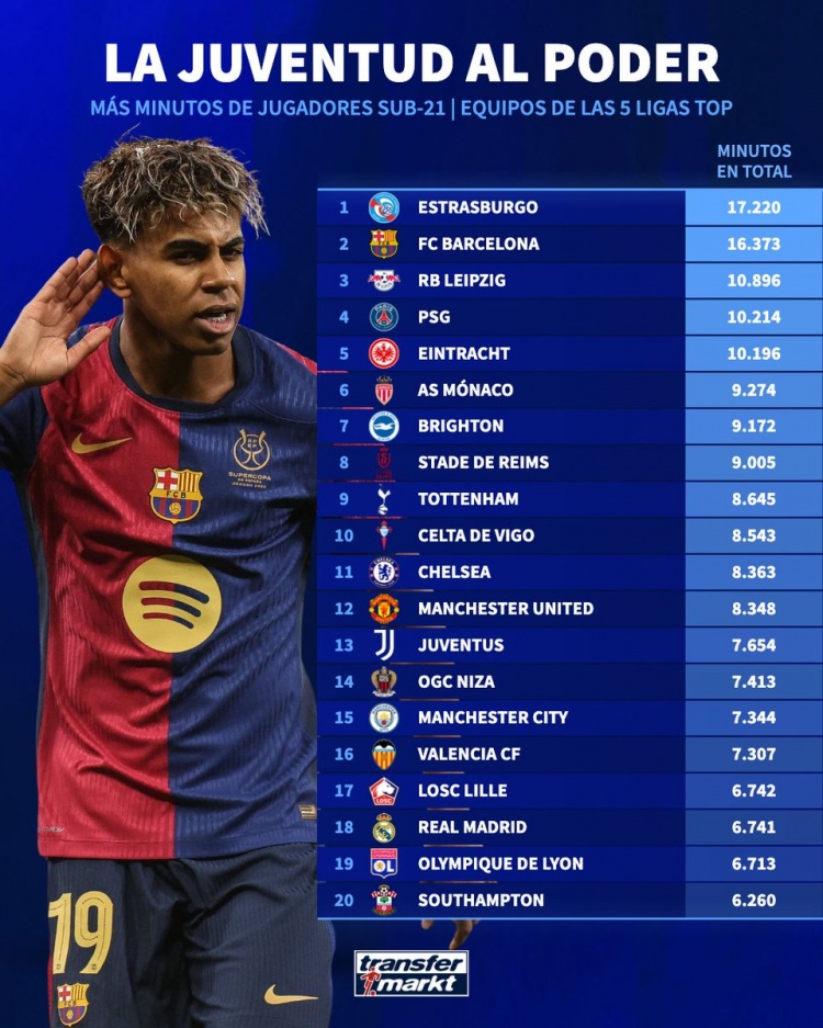 本賽季五大聯(lián)賽球隊(duì)U21出場(chǎng)時(shí)間排名: