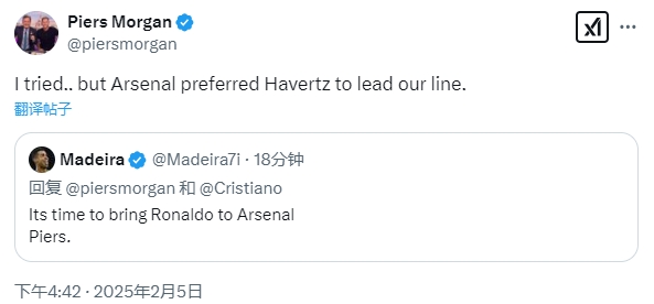 有球迷評(píng)論:“是時(shí)候把C羅帶到阿森納了,皮爾斯?!蹦Ω貜?fù):“我試過(guò)了……但阿森納更喜歡讓哈弗茨來(lái)領(lǐng)銜我們的鋒線(xiàn)。”