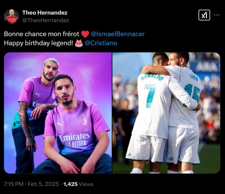 2月5日訊 今天是C羅40歲的生日,特奧也向他送上了生日祝福,同時(shí)還告別了離開(kāi)米蘭加盟馬賽的本納塞爾。