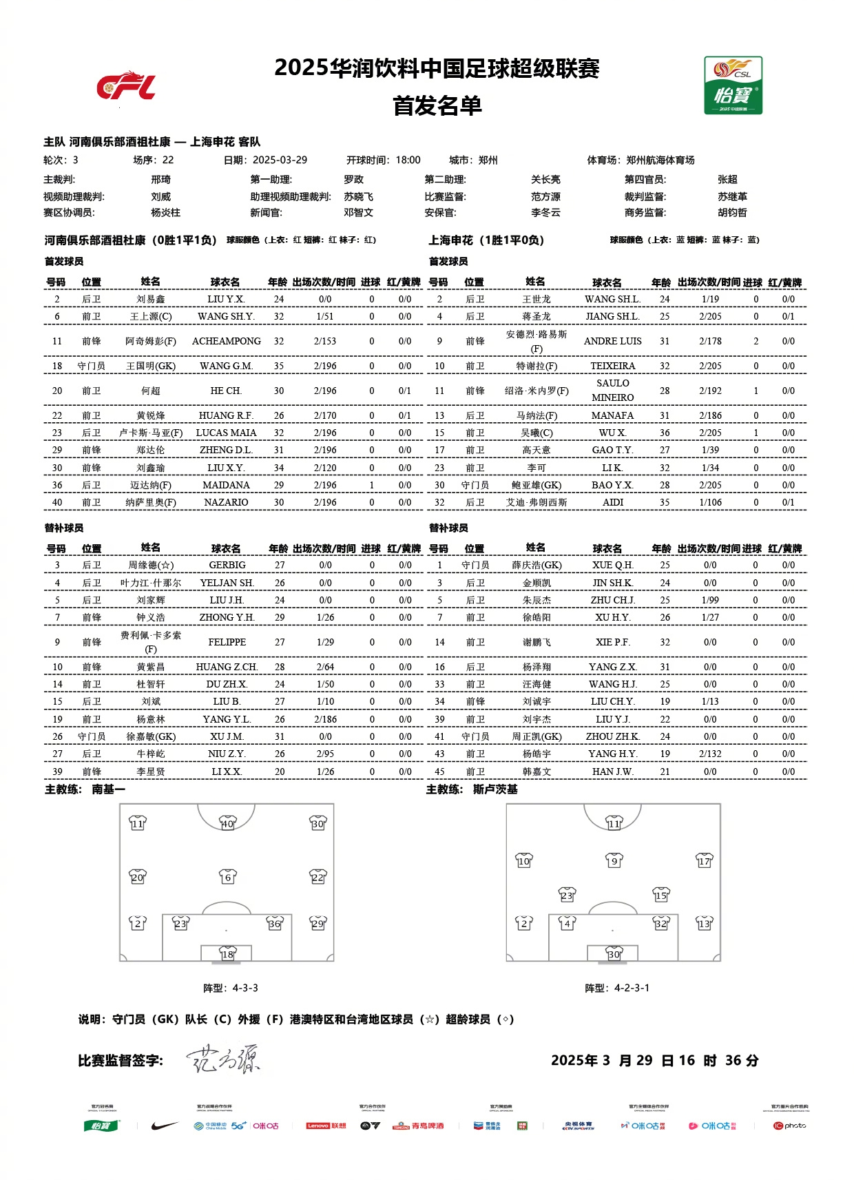 中超聯(lián)賽第3輪 河南俱樂(lè)部酒祖杜康vs上海申花 首發(fā)名單 ???