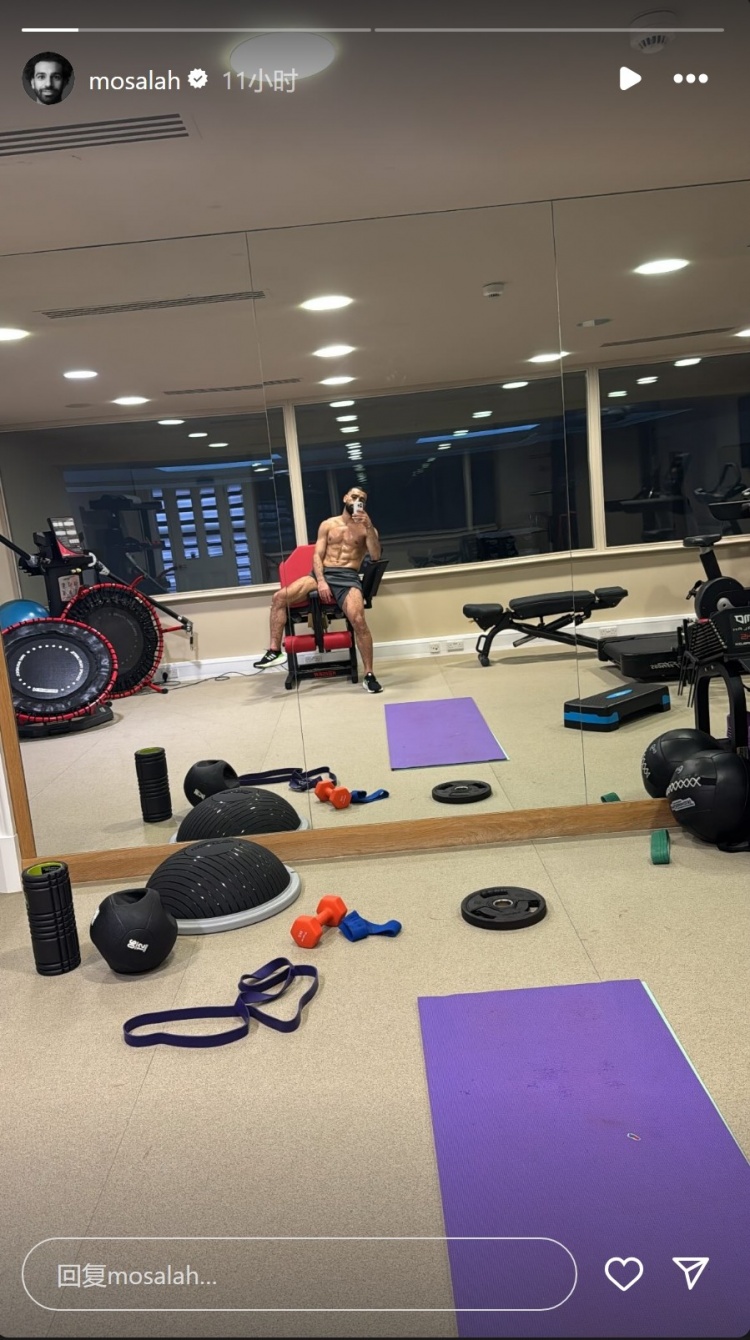 3月29日訊 利物浦前鋒薩拉赫更新社媒動(dòng)態(tài),曬出在健身房?jī)?nèi)的照片。