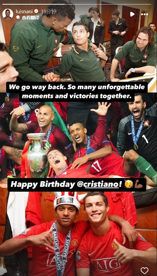 2月5日訊 今天是C羅的40歲生日,38歲的納尼更新動態(tài),送上了祝福。