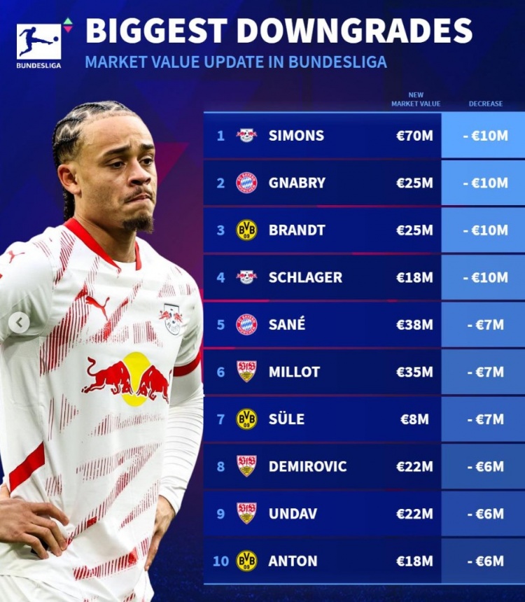 德轉(zhuǎn)列身價更新后德甲貶值榜:歐元