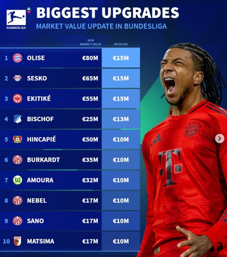 3月30日訊 《轉(zhuǎn)會市場》在此前更新了德甲球員身價,并列出了身價升值幅度最大情況,奧利塞等3人領銜。
