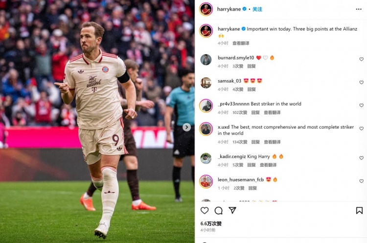 3月30日訊 拜仁在本輪德甲3-2險勝圣保利,凱恩傳射建功也在賽后通過社媒曬照慶祝。