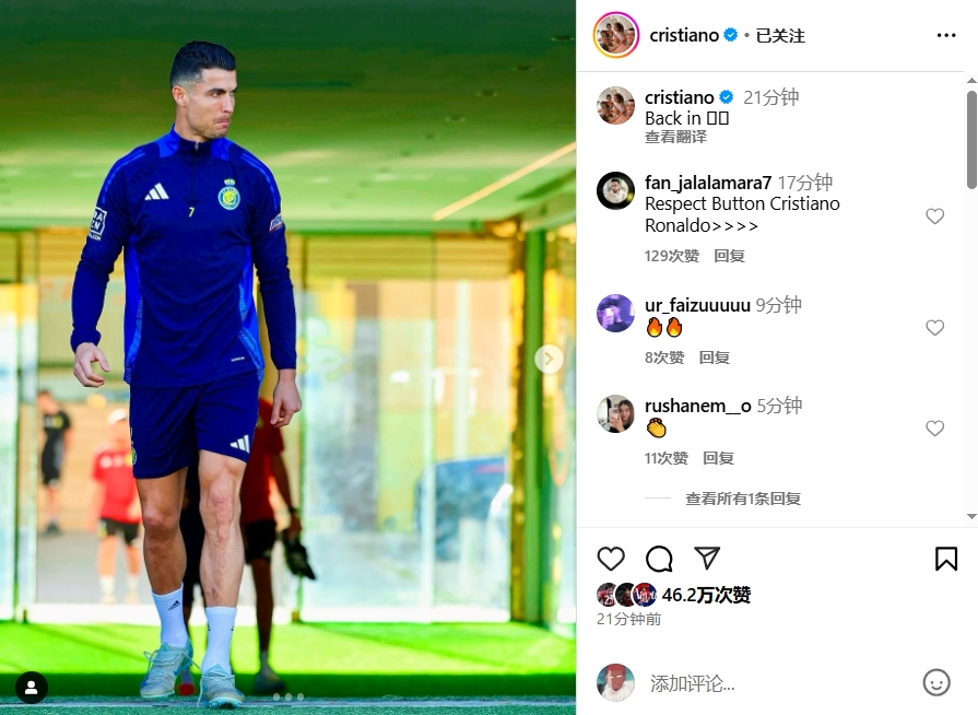 3月30日訊 今日C羅更新社媒,曬出自己身穿利雅得勝利訓(xùn)練服的照片,并配文Back in。