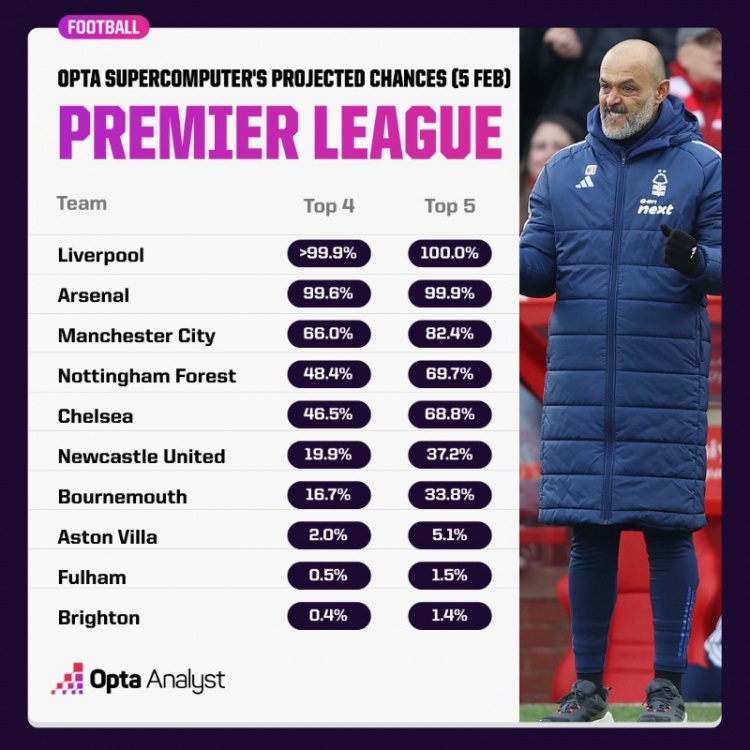 2月5日訊 由于本賽季英超球隊在歐戰(zhàn)表現(xiàn)搶眼,本賽季聯(lián)賽前五名大概率都能晉級下賽季歐冠。數(shù)據(jù)機構(gòu)OPTA也統(tǒng)計了英超球隊“爭五”概率,軍槍城車+諾丁漢森林處于優(yōu)勢地位。