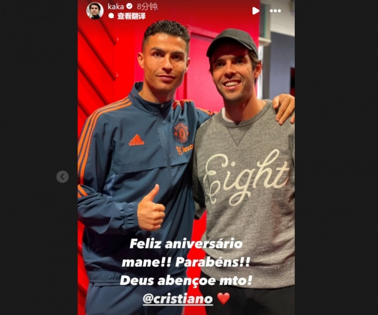 卡卡曬出兩人的合照,并配文:“生日快樂兄弟?。∽8D悖?!上帝保佑你!@C羅”。