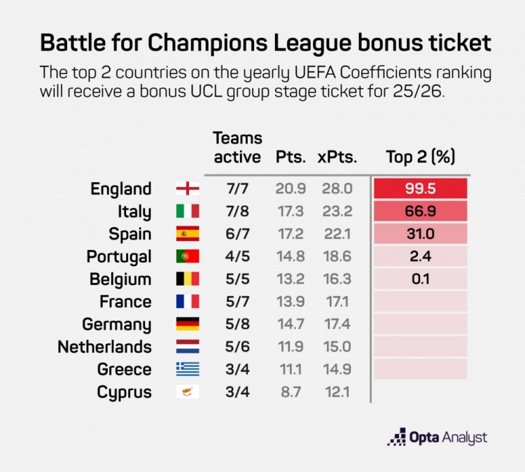 OPTA統(tǒng)計(jì)下賽季歐冠額外名額概率(共2個(gè)額外名額):