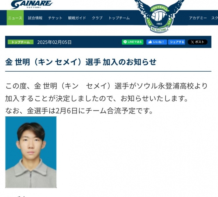 2月5日訊 J3聯(lián)賽球隊(duì)鳥取飛翔今日官方宣布,球隊(duì)正式從韓國首爾永登浦工業(yè)高中引進(jìn)中國球員金世明,球員將在2月6日與球隊(duì)會(huì)合,球員新賽季將身披28號(hào)球衣。