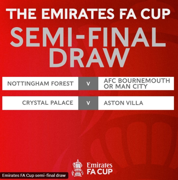 3月30日訊 足總杯1/4決賽結(jié)束三場較量,維拉、諾丁漢森林、水晶宮晉級,曼城與伯恩茅斯比賽即將開始。足總杯官方公布了半決賽抽簽結(jié)果,具體如下: