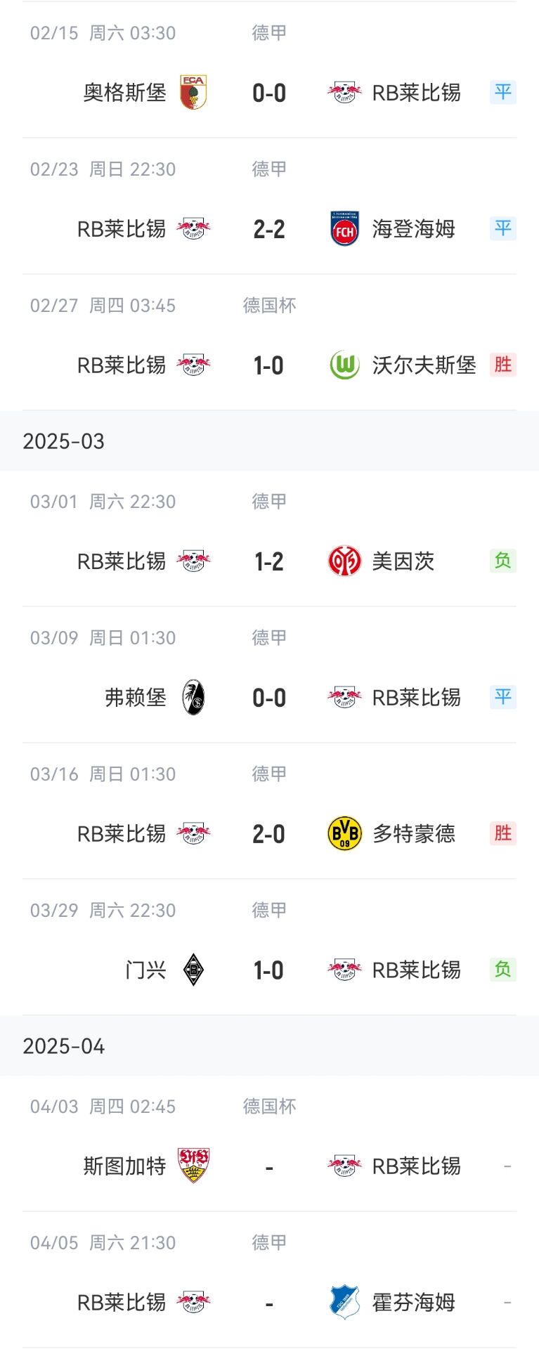 RB萊比錫近期戰(zhàn)績(jī)↓