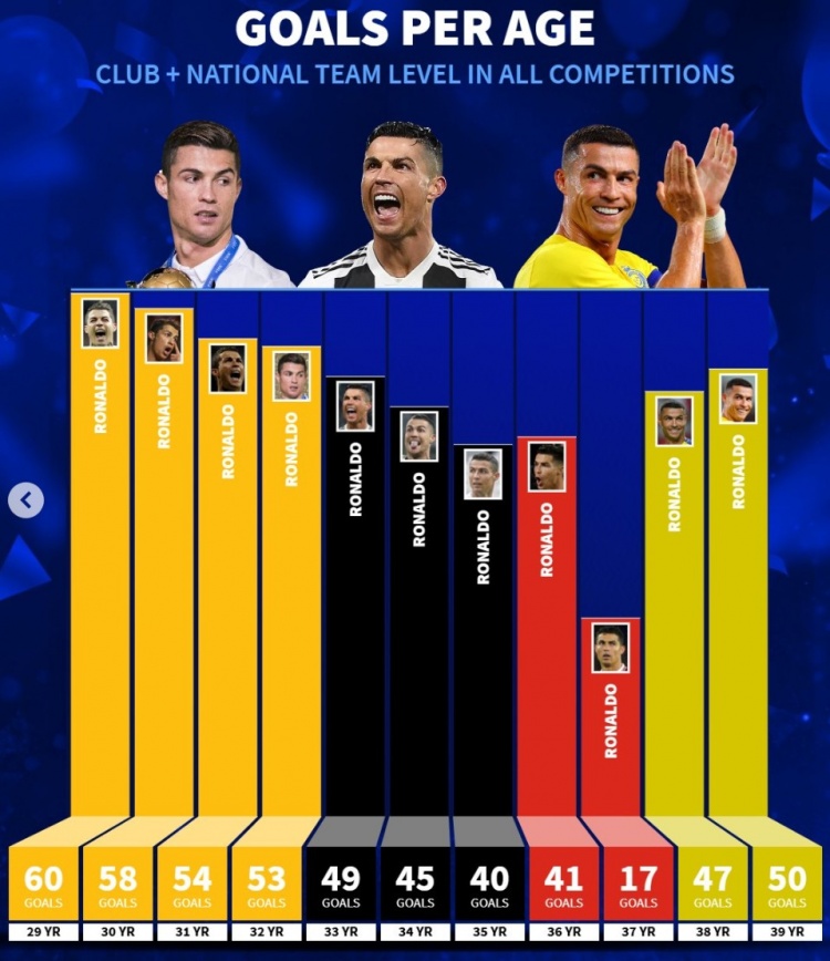 2月5日訊 C羅在今日迎來40歲生日,《轉(zhuǎn)會(huì)市場》也列出了C羅生涯每年的進(jìn)球情況。