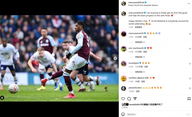 拉什福德賽后也在個人社媒曬出本場照片,配文寫道:“非常激動終于收獲在維拉首粒進(jìn)球,并且?guī)椭蜿爼x級半決賽。祝大家母親節(jié)&開齋節(jié)快樂?!?/p>