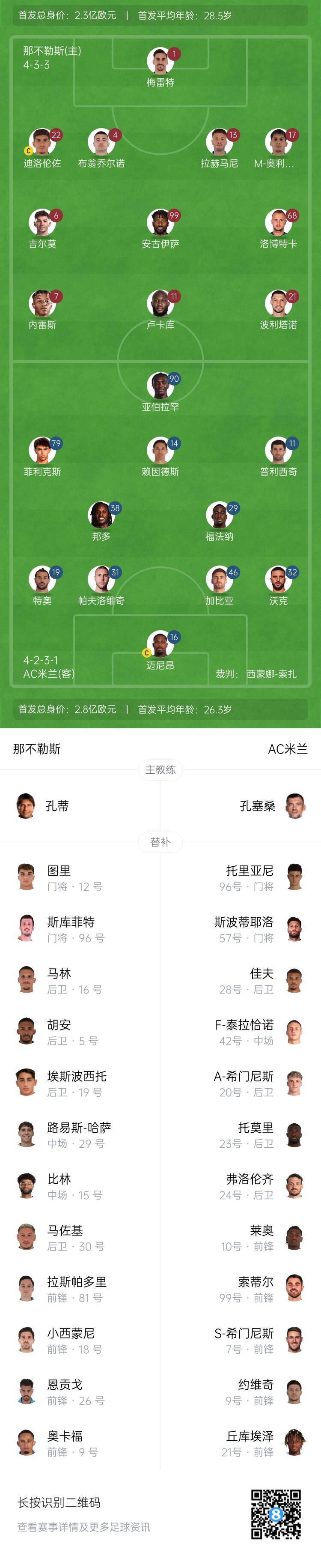 那不勒斯替補(bǔ):12-圖里、96-斯庫菲特、5-胡安、9-奧卡福、15-比林、18-小西蒙尼、19-埃斯波西托、26-恩貢戈、29-哈薩、30-馬佐基、81-拉斯帕多里