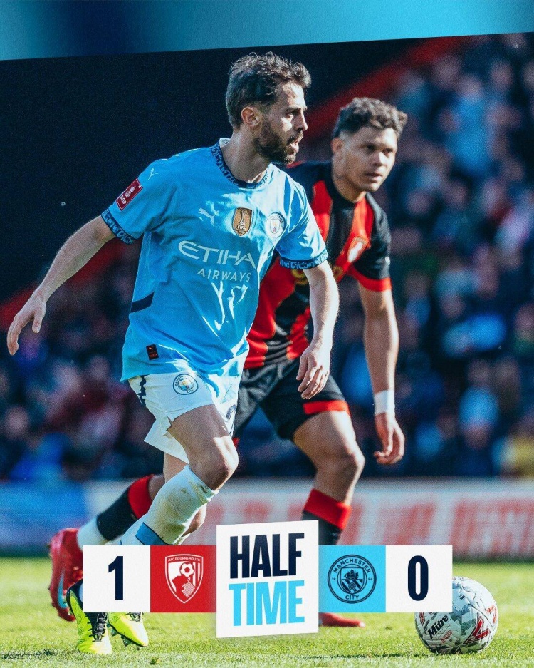 上半場傷停補(bǔ)時1分鐘,半場結(jié)束,伯恩茅斯暫1-0曼城。