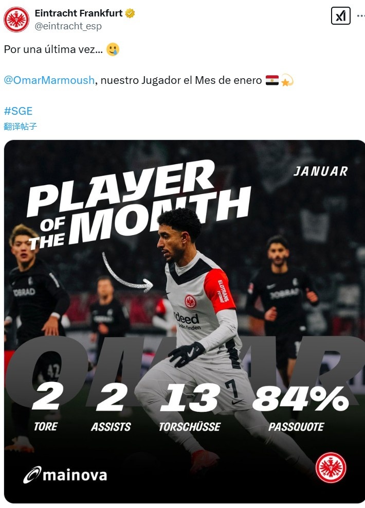 在1月份的比賽中,馬爾穆什一共打進(jìn)2球,并奉獻(xiàn)了2次助攻,13腳射門和84%的傳球成功率。因?yàn)樵陉?duì)內(nèi)出色的表現(xiàn),法蘭克福將他評(píng)為1月份最佳球員。