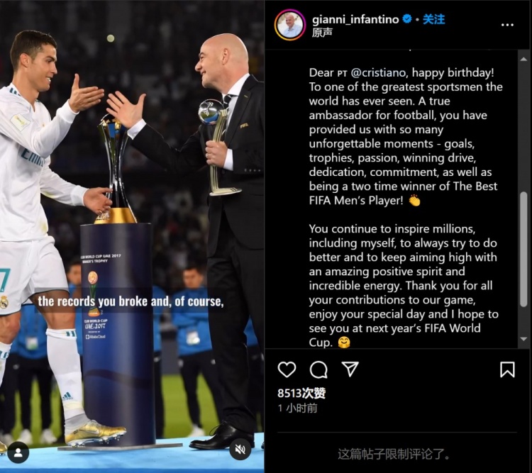 因凡蒂諾寫(xiě)道:親愛(ài)的C羅,生日快樂(lè)!向世界上最偉大的運(yùn)動(dòng)員之一致敬。作為真正的足球大使,你為我們提供了如此多令人難忘的時(shí)刻——進(jìn)球、獎(jiǎng)杯、激情、獲勝的動(dòng)力、奉獻(xiàn)、承諾,以及兩次當(dāng)選FIFA最佳球員!????