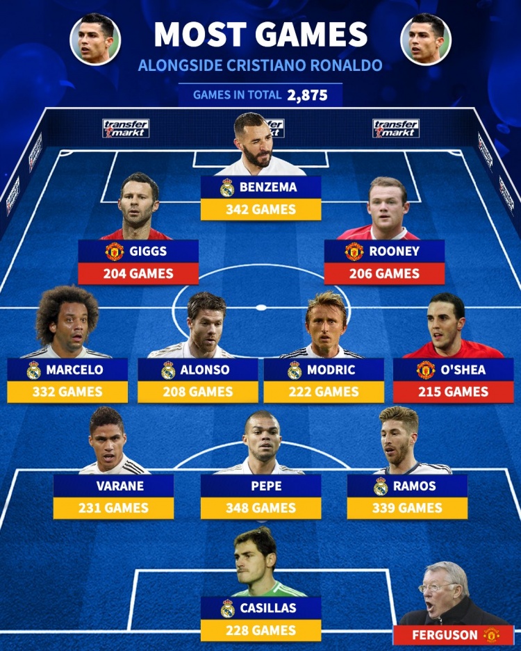 2月6日訊 在C羅慶祝40歲生日之際,德轉(zhuǎn)列出了C羅職業(yè)生涯中,和他同時出場次數(shù)最多的隊友陣容。其中,同場作戰(zhàn)348次的佩佩是和C羅一起出場次數(shù)最多的隊友,魯尼、本澤馬、魔笛上榜。
