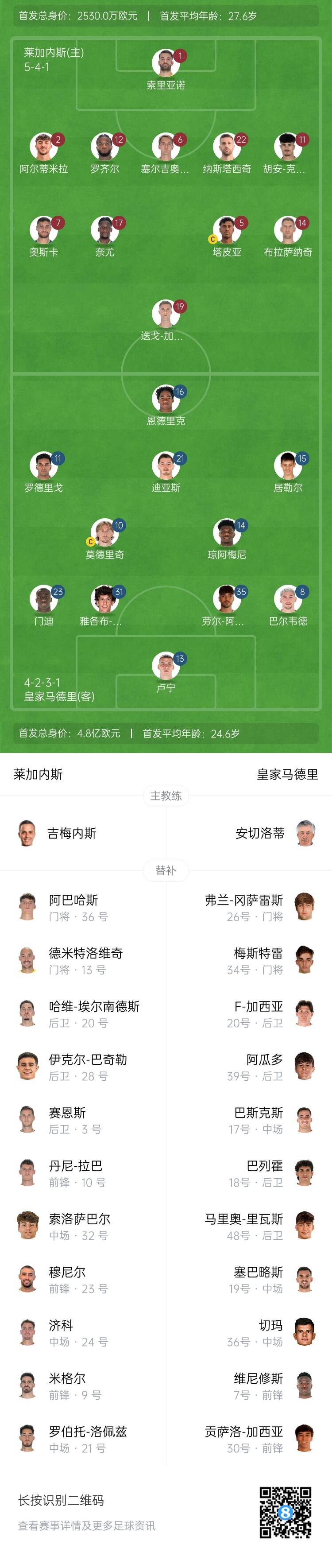 皇馬替補(bǔ):26-弗蘭-岡薩雷斯、34-梅斯特雷、7-維尼修斯、17-巴斯克斯、18-巴列霍、19-塞巴略斯、20-弗蘭-加西亞、30-岡薩洛-加西亞、36-切瑪、39-洛倫佐-阿瓜多、48-馬里奧-里瓦斯