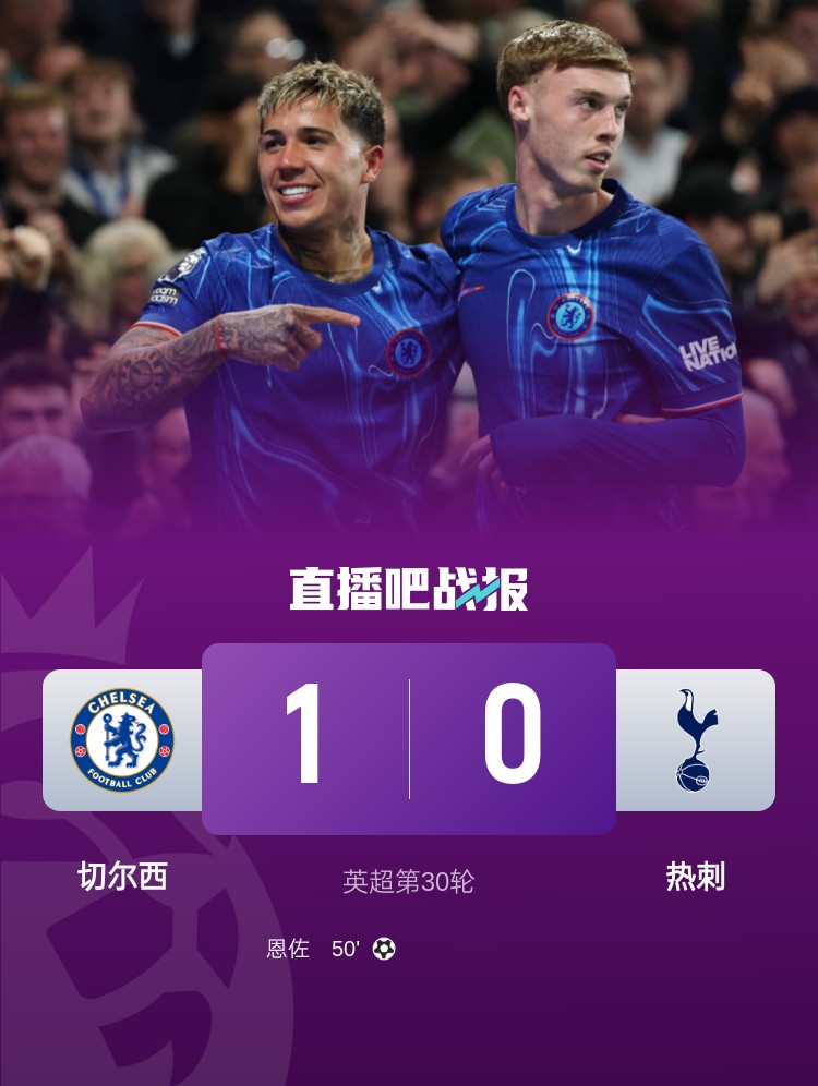 本輪英超焦點戰(zhàn),切爾西1-0擊敗熱刺,恩佐打入全場唯一進球。