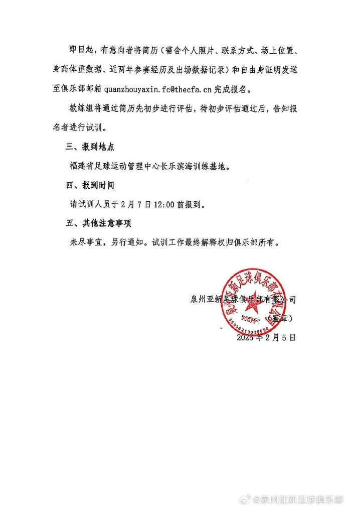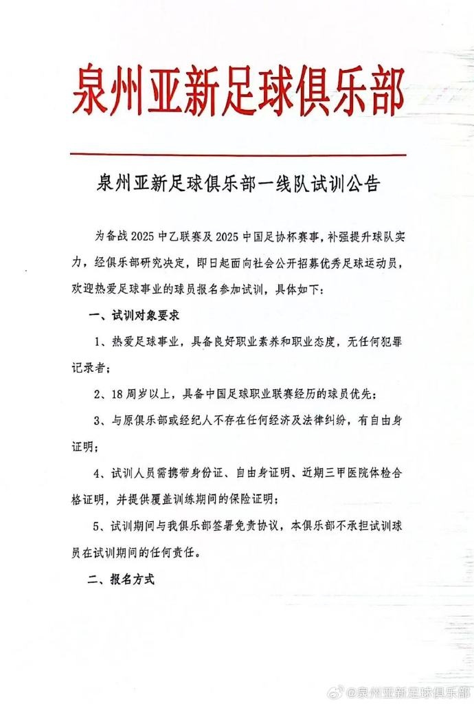泉州亞新官方表示,為備戰(zhàn)新賽季中乙聯(lián)賽及中國(guó)足協(xié)杯,補(bǔ)充提升球隊(duì)實(shí)力,俱樂(lè)部決定公開(kāi)招募優(yōu)秀足球運(yùn)動(dòng)員。