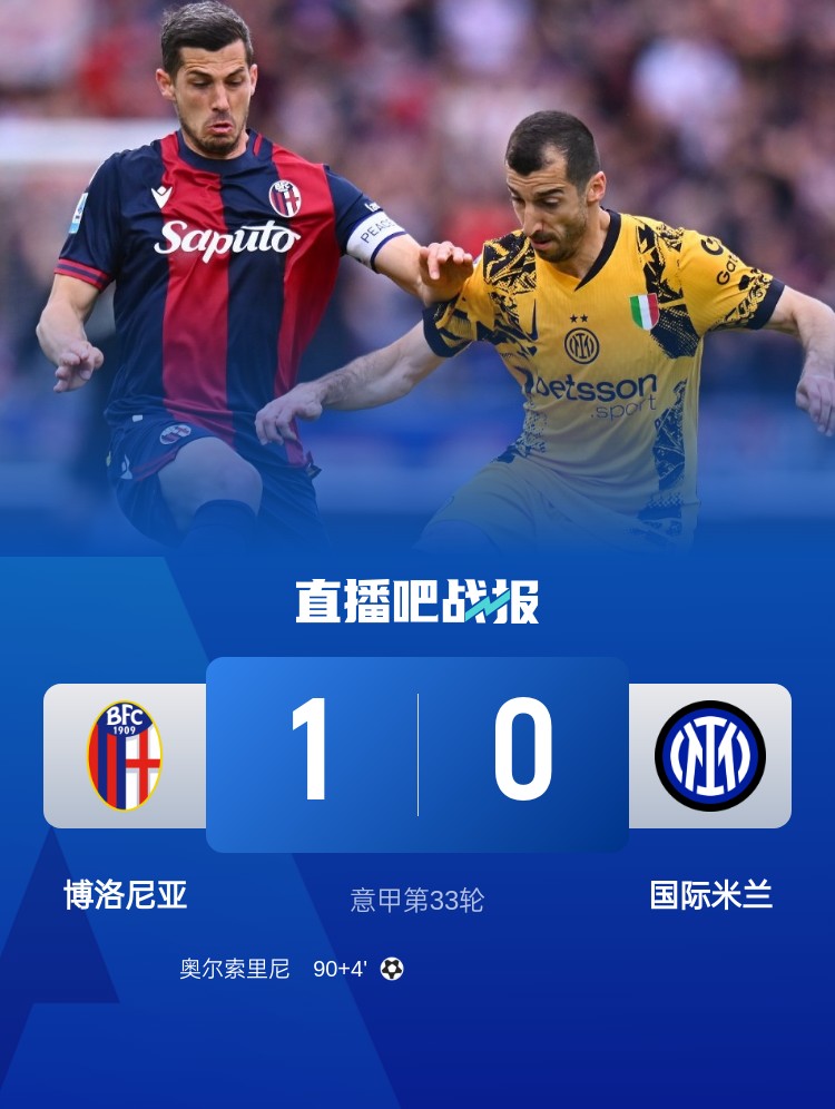 讀秒遭絕殺!國米0-1博洛尼亞凈勝球優(yōu)勢領跑 3天后意杯戰(zhàn)米蘭