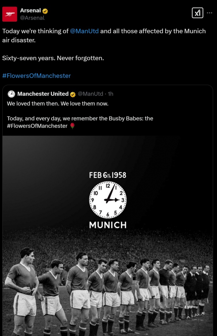 阿森納寫道:今天,我們向曼聯(lián)和所有受到慕尼黑空難影響的人們致以哀思。六十七年過去了,我們永遠(yuǎn)不會(huì)忘記。