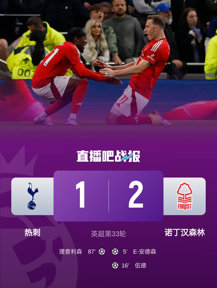 熱刺1-2不敵森林,賽季遭對手雙殺!森林終結英超2連敗,排名升至第3。