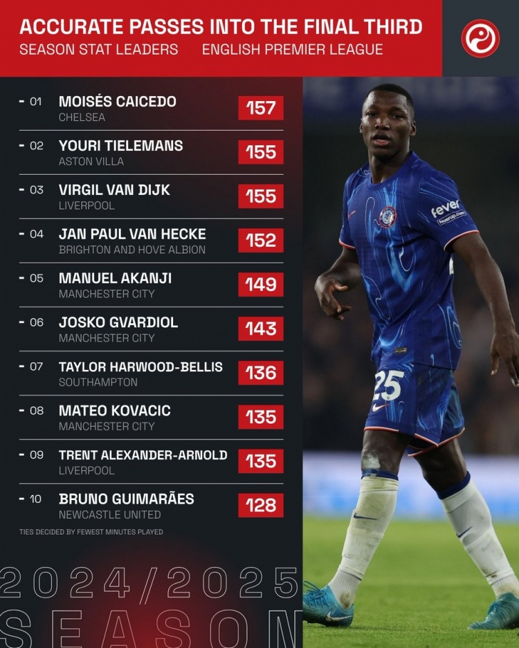 本賽季英超傳球到進(jìn)攻三區(qū)榜:(次數(shù)相同,出場時(shí)間更少者排名在前)