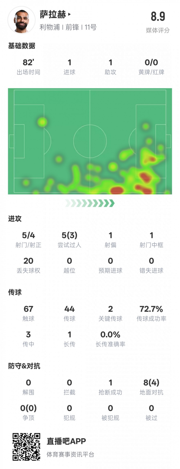 薩拉赫本場(chǎng)比賽數(shù)據(jù):