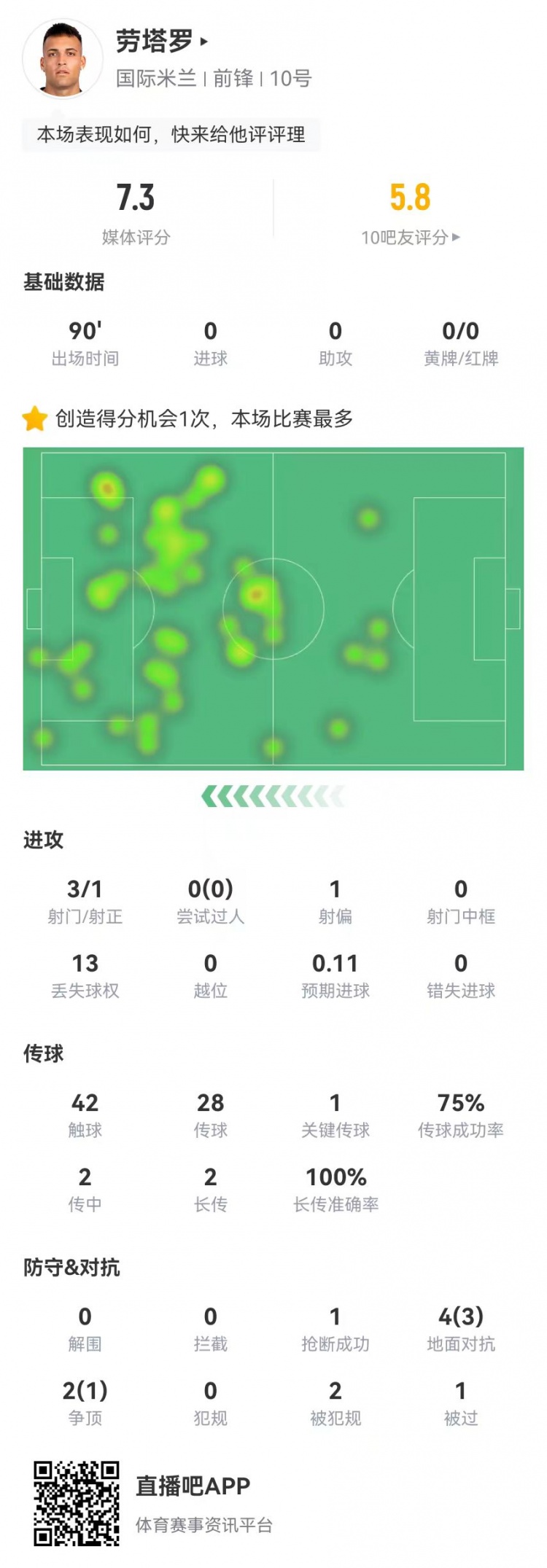 2月7日訊 國(guó)米在本輪意甲補(bǔ)賽0-3不敵佛羅倫薩,勞塔羅本場(chǎng)數(shù)據(jù)如下: