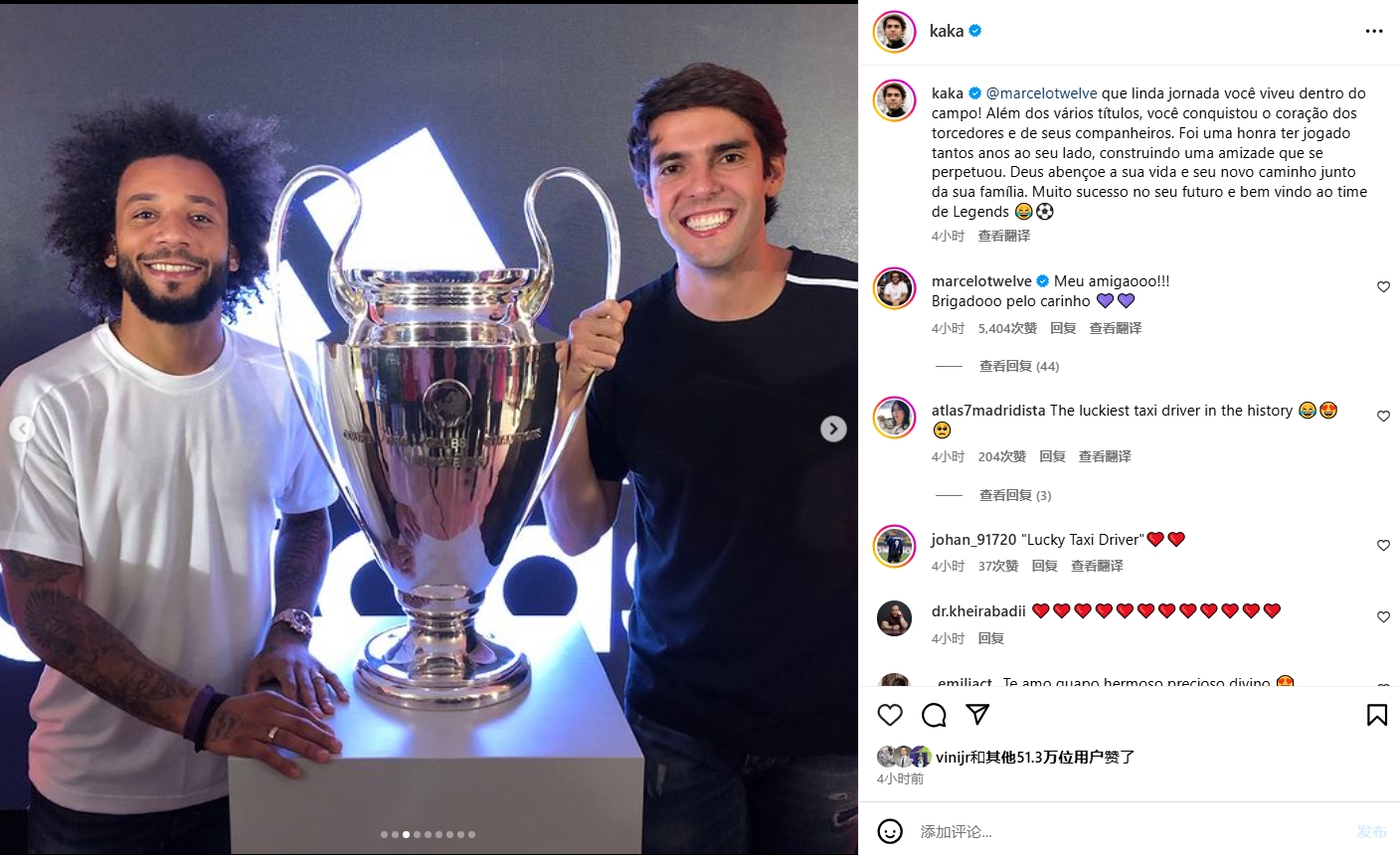 卡卡社媒曬出與馬塞洛的合照,并寫(xiě)道:“馬塞洛,你在球場(chǎng)上的旅程多么美好!除了許多冠軍,你還贏得了球迷和隊(duì)友的心?!?/p>
