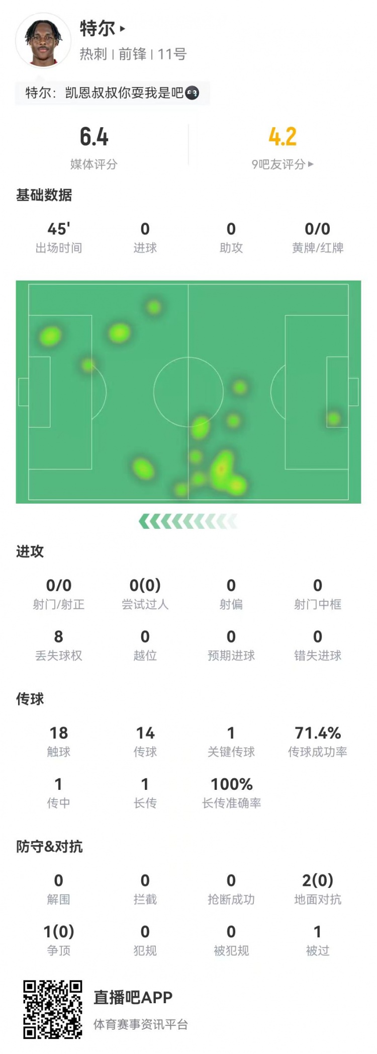特爾首秀數(shù)據(jù):替補45分鐘0射門+1關鍵傳球 3對抗0成功 獲評6.4分