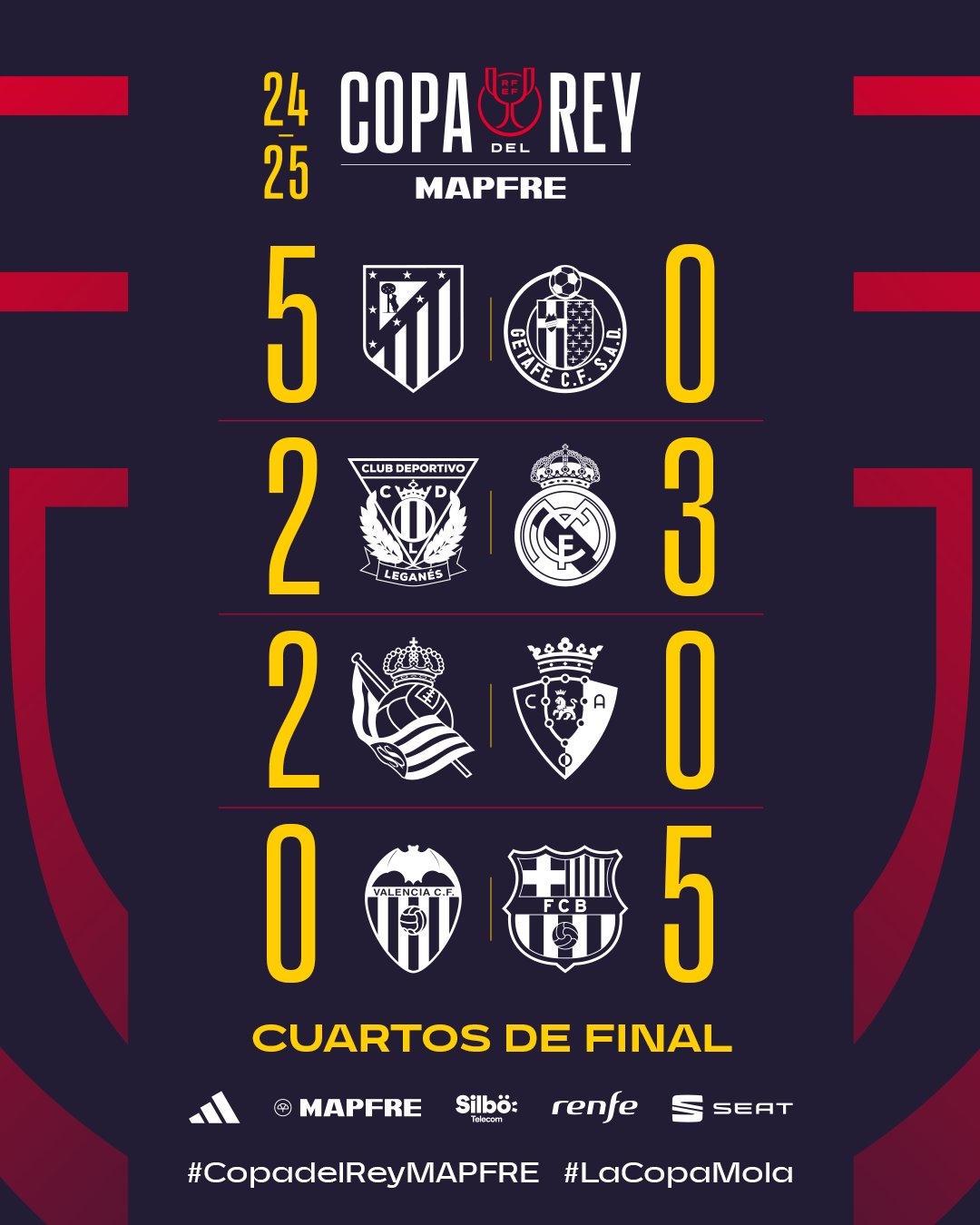 02月07日訊 今日凌晨國王杯8強(qiáng)賽,巴薩5-0大勝瓦倫西亞,與皇馬、馬競、皇社共同晉級4強(qiáng)。