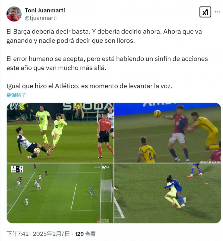 2月7日訊 巴薩跟隊記者Toni Juanmartí更新社媒動態(tài),曬出巴薩本賽季遭到誤判的視頻截圖,并表示巴薩應(yīng)該發(fā)聲。