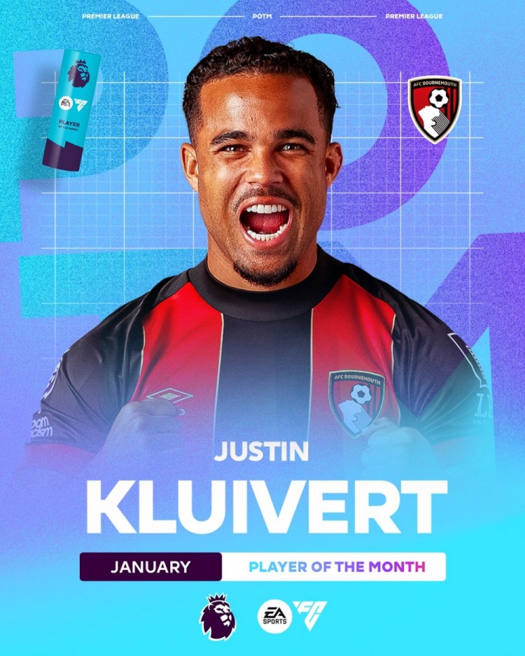 2月7日訊 英超官方宣布,伯恩茅斯邊鋒賈斯汀-克魯伊維特當選英超1月最佳球員。