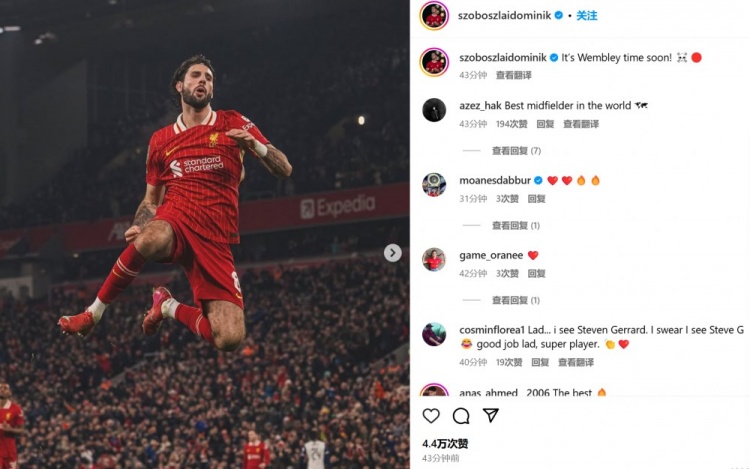 索博斯洛伊也在賽后通過社媒曬出自己的慶祝照,并配文:“接下來是溫布利時(shí)間!”利物浦將在溫布利舉行的聯(lián)賽杯決賽對(duì)陣紐卡。