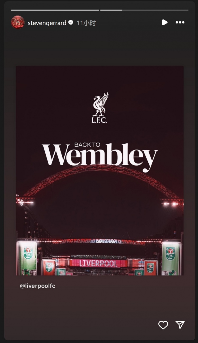 利物浦傳奇球星杰拉德更新社媒動(dòng)態(tài),曬出利物浦重返溫布利(決賽場地)的海報(bào),祝賀老東家晉級聯(lián)賽杯決賽。