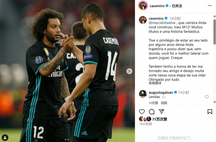 2月7日訊 巴西傳奇球星馬塞洛退役,前皇馬隊(duì)友卡塞米羅也在社媒曬出昔日合影為其送上祝福。