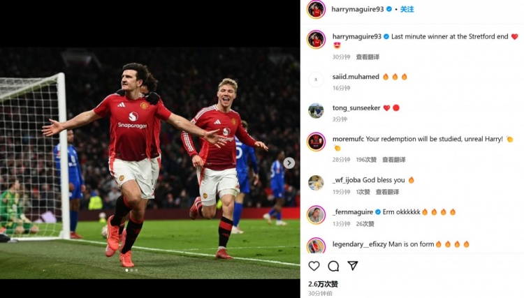 馬奎爾也在賽后通過社媒曬出自己的慶祝照,并配文:“在老特拉福德最后一刻打進制勝球!”