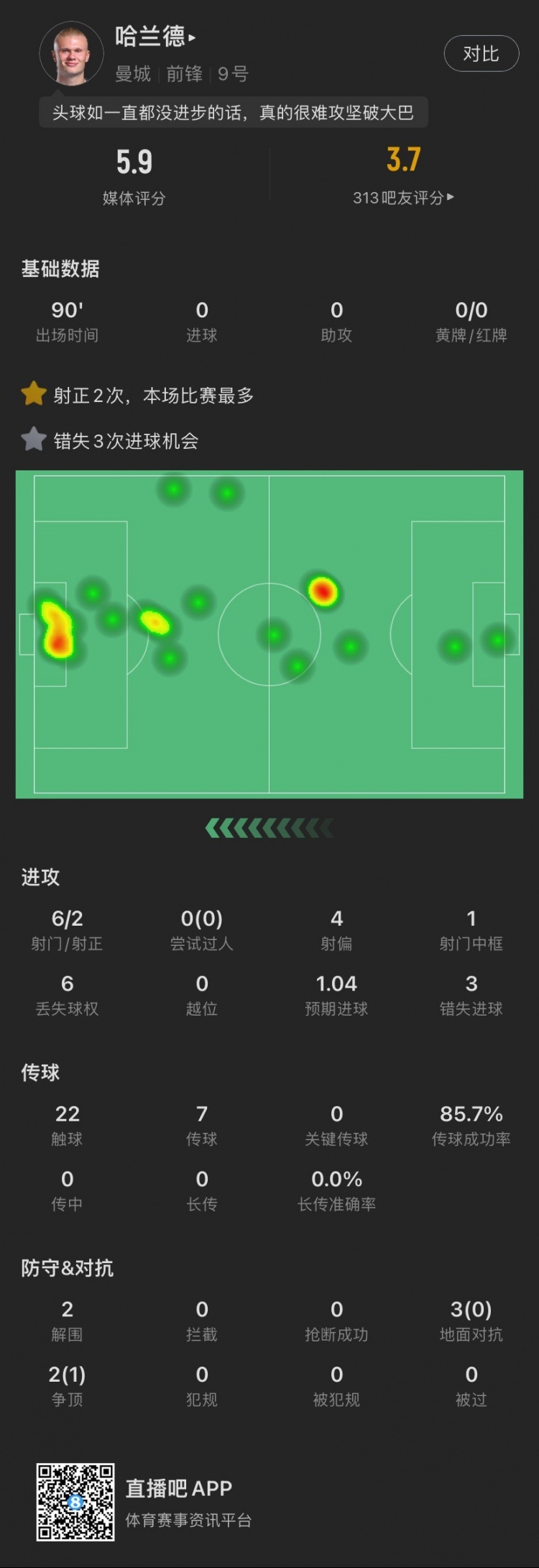 11月3日訊 在剛剛結束的英超第十輪比賽中,曼城1-2爆冷輸給伯恩茅斯。本場比賽,哈蘭德狀態(tài)欠佳顆粒無收,錯失3次絕佳機會,Sofascore評分僅為不及格的5.9,全場最低。