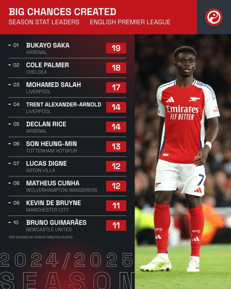2月8日訊 squawka統(tǒng)計了本賽季英超創(chuàng)造重大機(jī)會情況,薩卡力壓帕爾默居首。