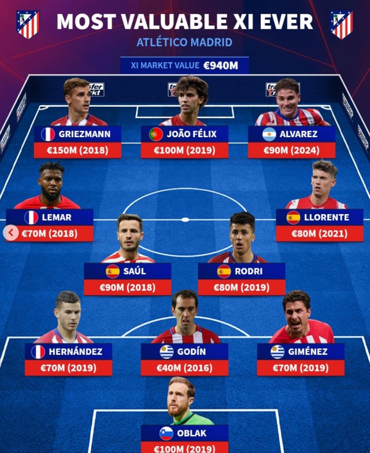 前鋒:格列茲曼(2018,1.5億)、菲利克斯(2019,1億)、阿爾瓦雷斯(2024,9000萬(wàn))