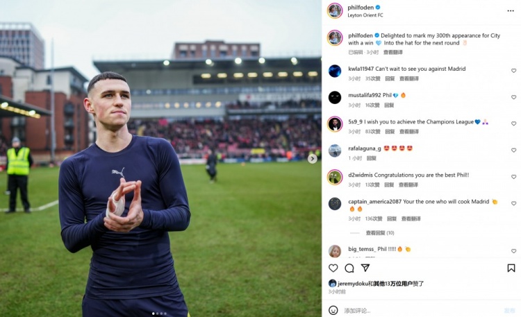 福登也達(dá)成了曼城生涯300次出場里程碑,賽后他在個(gè)人社媒曬出本場照片,配文寫道:“很高興能以一場勝利紀(jì)念自己的曼城300場之戰(zhàn),挺進(jìn)足總杯下一輪!”