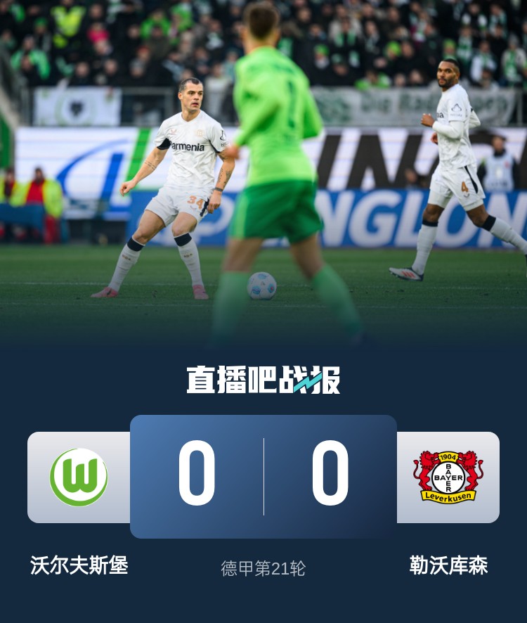 勒沃庫森本輪0-0戰(zhàn)平沃爾夫斯堡,目前球隊(duì)落后榜首8分。
