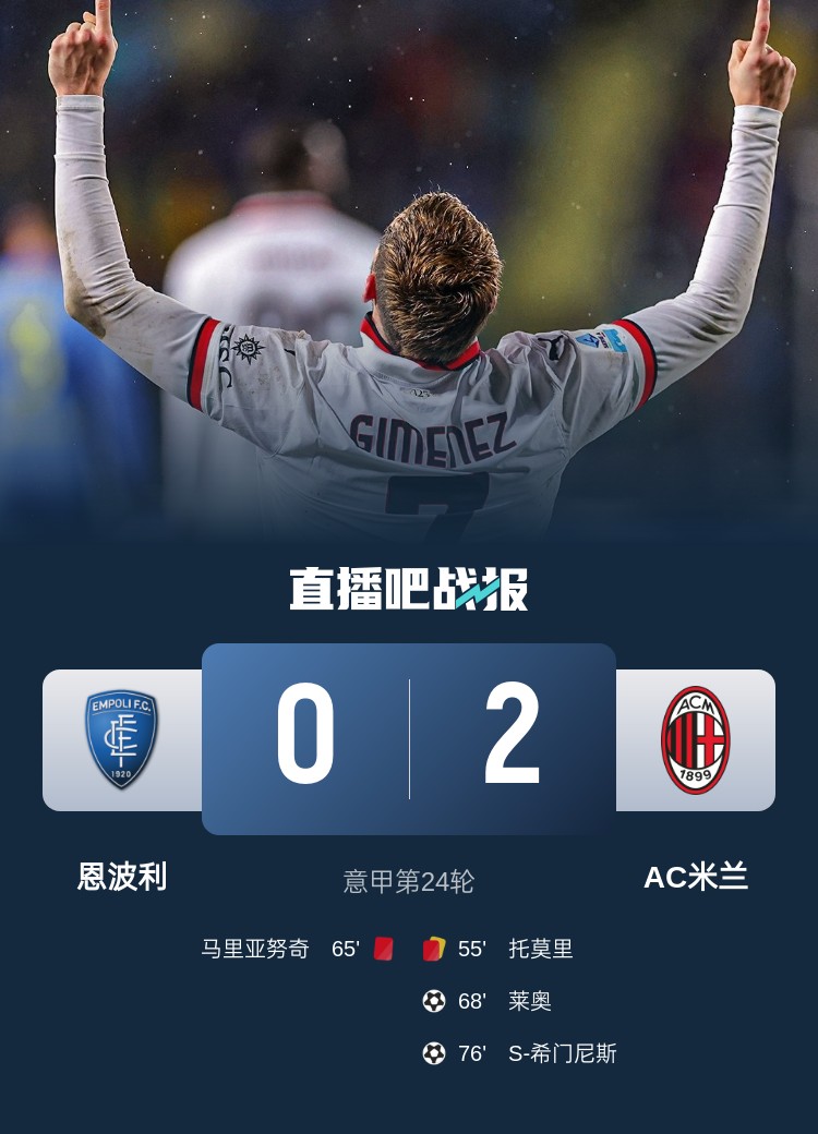 米蘭本輪2-0擊敗恩波利,雙方在下半場都被罰下一人,最終米蘭憑借萊奧和新援S-希門尼斯的進(jìn)球拿下勝利。