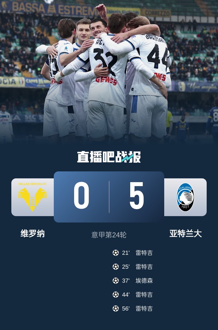 亞特蘭大本輪5-0橫掃維羅納,雷特吉大四喜成為本場絕對明星。